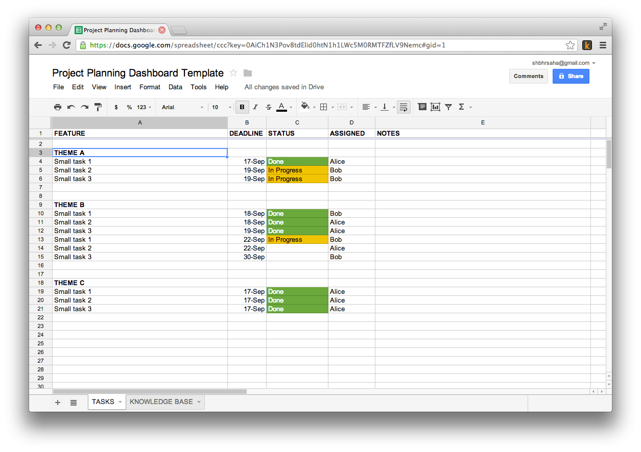 There are two sheets in the dashboard. In the first sheet, the project is broken into smaller tasks that can be assigned to teammates. It doesn’t matter who assigns tasks, but everyone should have something to work on. As tasks are completed, the status column updates from blank, to “In Progress”, to “Done”. Conditional formatting makes knocking down tasks a pure joy.